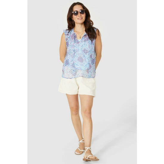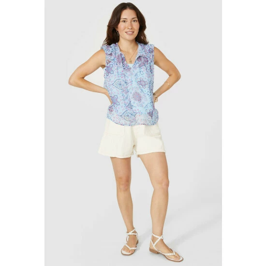Sleeveless Frill Yoke Motif Print Top