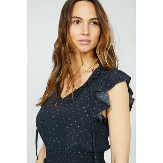 Sleeveless spot print ruffle dress from Mantaray. Casual and comfortable without sacrificing on style. Crafted from a lightweight fabric, this dress features a spot print all over, a ruffled skirt, a ruched waistband, a frill collar and self-tie neck.