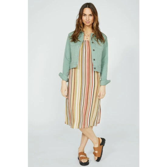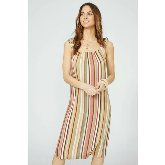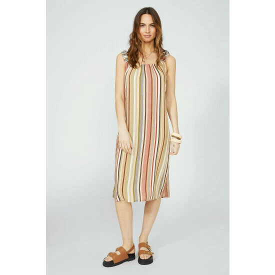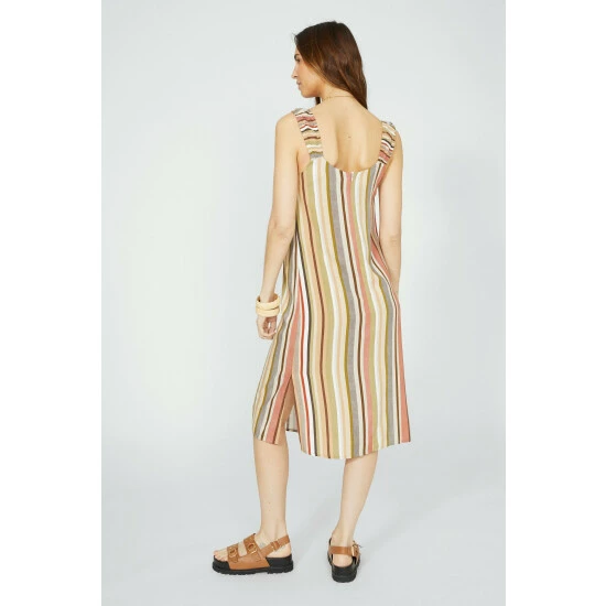 Strappy stripe print scoop neck dress from Mantaray. Perfect for making an impact on warmer days, this sleeveless dress features a stunning stripe print all over, a scoop neck and ruched straps.