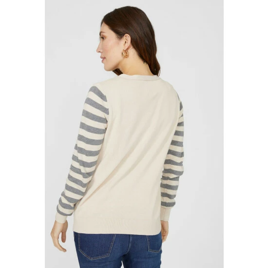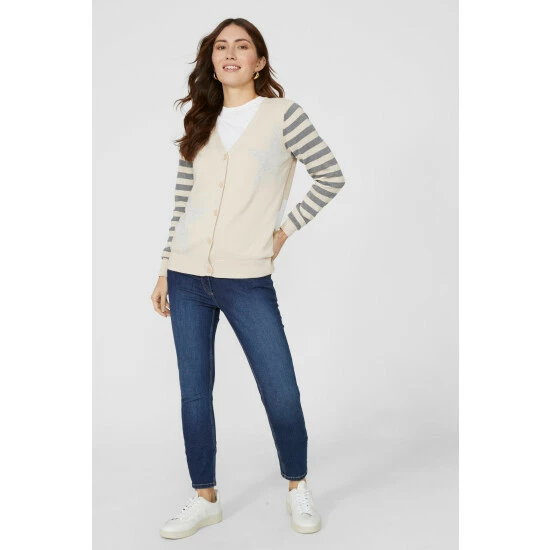 Stripe Sleeve Star Intarsia Cotton V Cardigan from Mantaray. Elevate your knitwear style with beautiful designs and opt for this star cotton cardigan. Featuring long soft stripe sleeves with cuff detailing, front button detailing, a beautiful star print and a tailored cut finish. Made from 100% Cotton. Wash at 40. Model wears a Size 10.