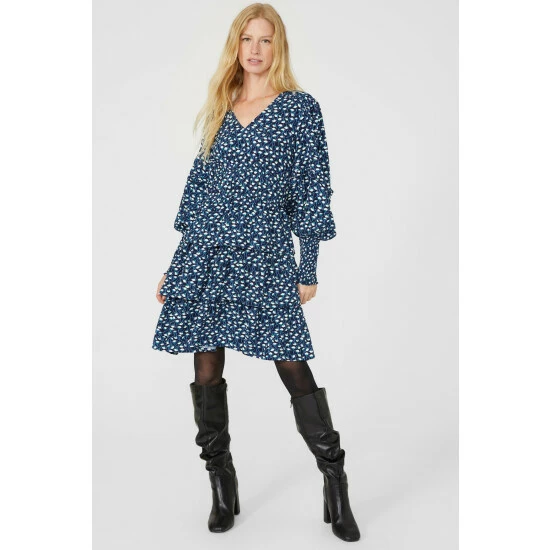 Trailing Floral Tiered Skirt Dress from Mantaray. Inject vibrant dress designs crafted from luxe fabrics into your wardrobe and discover this must-have women’s floral dress today. Featuring long comfortable sleeves with frill cuff detailing, a comfortable circular neckline, and a feminine floral print finish. Style with black tights and coordinate with leather knee-high boots. Crafted from 100% Viscose. Wash at 30. Model wears a Size 10.