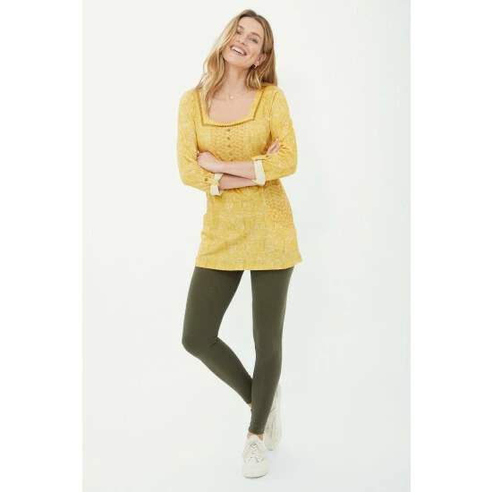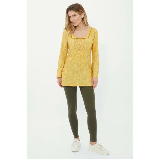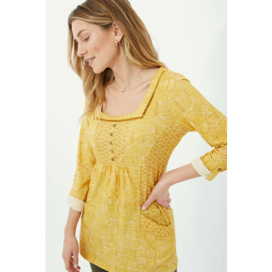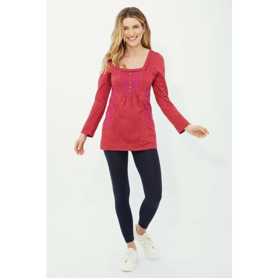 Triangle print square neck tunic from Mantaray. In a gorgeous triangle print, this relaxed tunic finishes below the hips for a flattering fit. Perfect for work and weekends alike, it features a pretty cut out embroidery along the square neck, placket buttons and rolled sleeves with a buttoned tab. Other colours available.