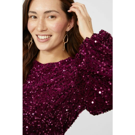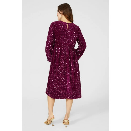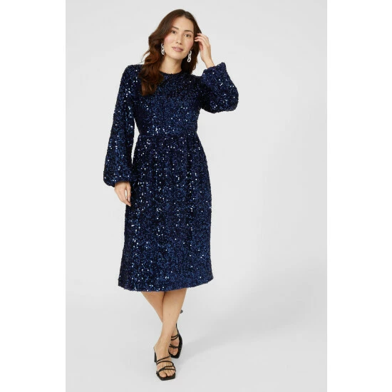 Velvet Tiered Sequin Dress from Mantaray. Shimmer in luxe occasionwear styles and select this must-have women’s sequin dress. Featuring long oversized sleeves, a comfortable neckline, a cinched waistline, and a tailored cut finish for a figure-flattering silhouette. Made from 100% polyester. Wash at 40. Model wears a Size 10.