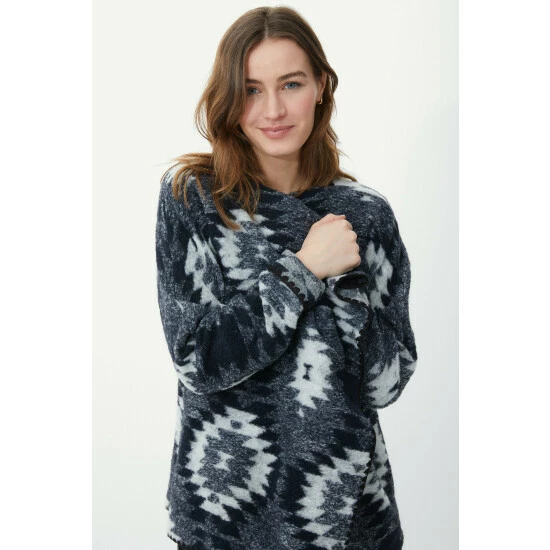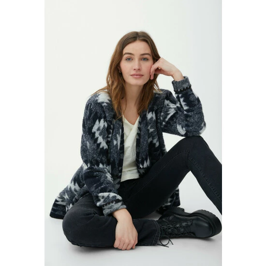 Knitted waterfall jacket from Mantaray. Perfect for keeping cosy on chilly spring nights, this relaxed jacket features a flattering waterfall neckline, an eye-catching monochrome graphic print and self-fabric tie-belt. Crafted from a chunky wool-blend fleece for day long warmth and comfort, all you need is a soft jersey top underneath and jeans for a stunning look.